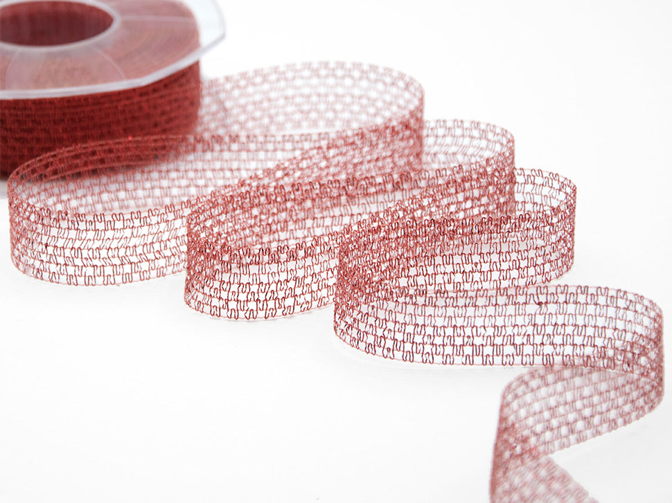 Antares Lurex 28 MM Rosso. Rete sottile, con tramatura fitta ad effetto vedo non vedo, adatta per fiocchi e confezioni natalizie, si abbina con tutte le carte per pacchi regalo. L’articolo R300 è un nastro di rete di colore metallico.