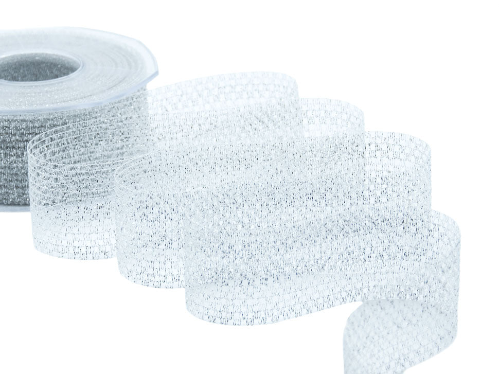 Antares Lurex 40 MM Argento. Rete sottile, con tramatura fitta ad effetto vedo non vedo, adatta per fiocchi e confezioni natalizie, si abbina con tutte le carte per pacchi regalo. L’articolo R300 è un nastro di rete di colore metallico.