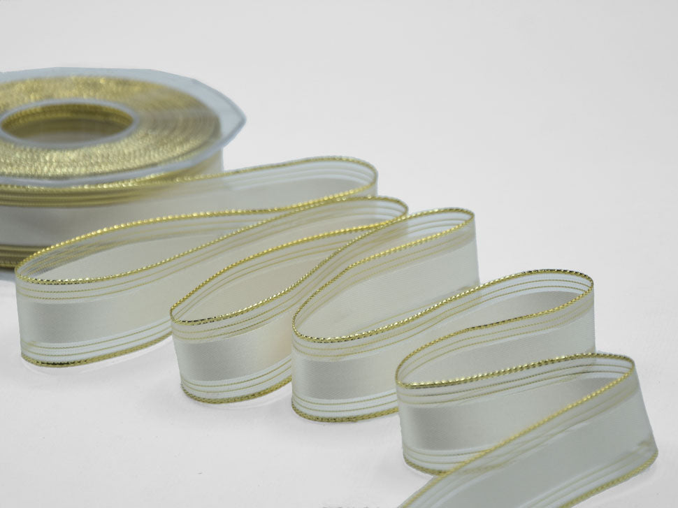 Baccarat Bordi Rame 25 MM Avorio. Il nastro Baccarat è un nastro fine e brillante, ha i bordi velati e la fascia centrale in raso.