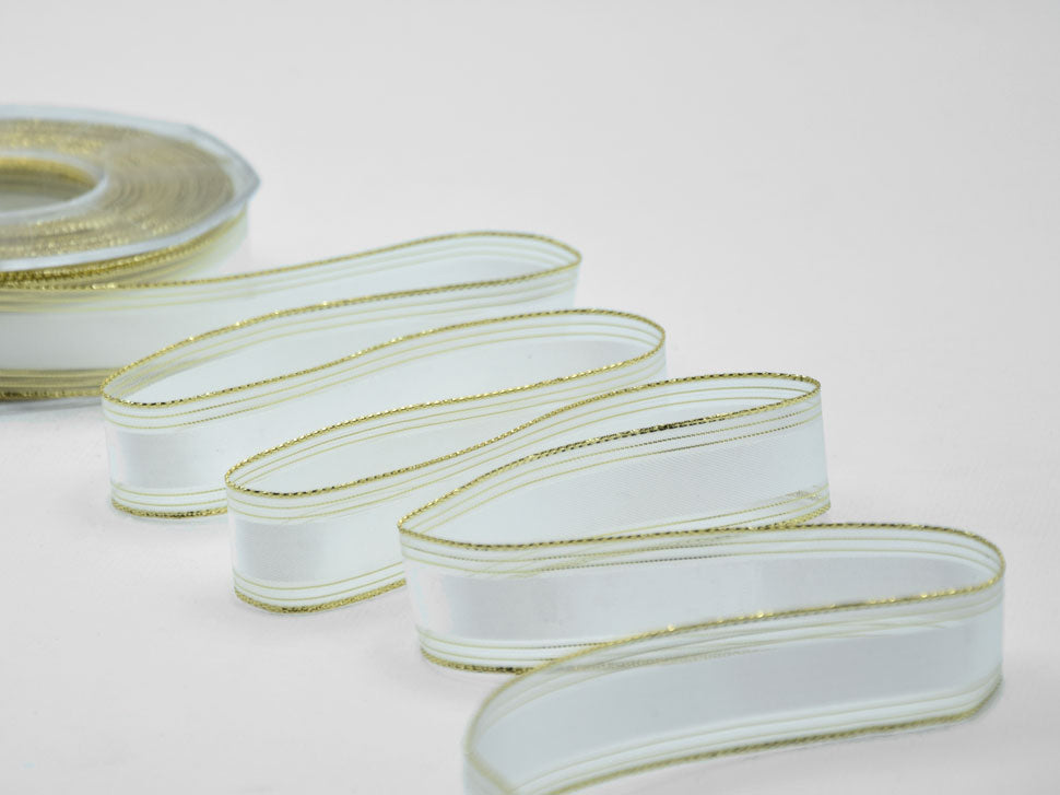 Baccarat Bordi Rame 25 MM Bianco Naturale. Il nastro Baccarat è un nastro fine e brillante, ha i bordi velati e la fascia centrale in raso.