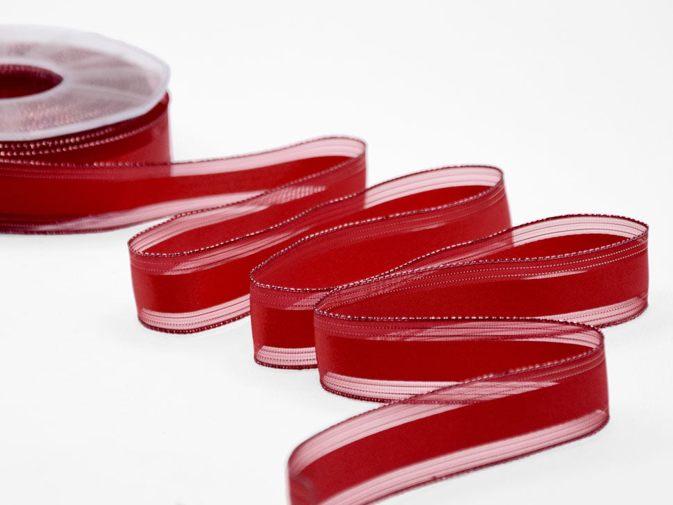 Baccarat Bordi Rame 25 MM Rosso. Il nastro Baccarat è un nastro fine e brillante, ha i bordi velati e la fascia centrale in raso.