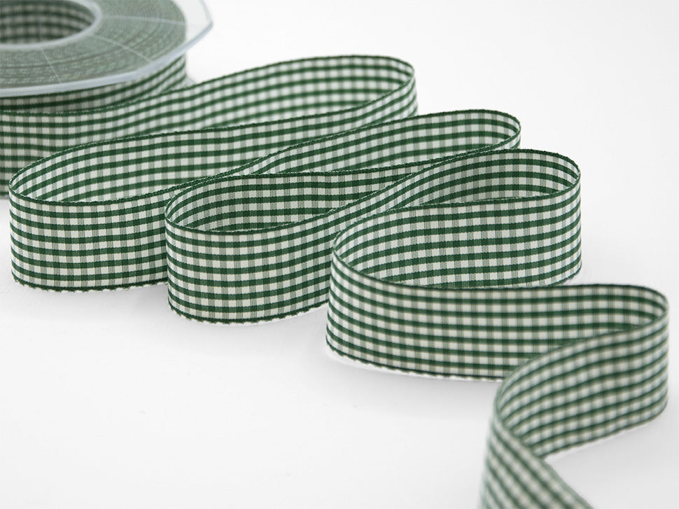 Bamby 25 MM Verde Inglese. Il Bamby è un nastro a quadretti, detto anche vichy, adatto agli utilizzi per le decorazioni dei bambini, come i fiocchi di nascita bimbo e bimba, oppure, negli altri colori, per confezioni country e rustiche. In questa versione è presentato con l'elastico su un bordo a formare una rouge molto comoda da applicare sui bordi. L’articolo T20/25 è un nastro con il motivo classico a quadri con bordi rifiniti più spessi