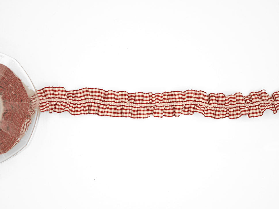 Bamby Con Elastico Centr. 25 MM Amaranto. È un nastro a quadretti, detto anche vichy, adatto agli utilizzi per le decorazioni dei bambini, come i fiocchi di nascita bimbo e bimba, oppure, negli altri colori, per confezioni country e rustiche. In questa versione è presentato con l'elastico su un bordo a formare una rouge molto comoda da cucire. Codice colore# 46 - CONFEZIONATO IN BOBINA DA METRI 5