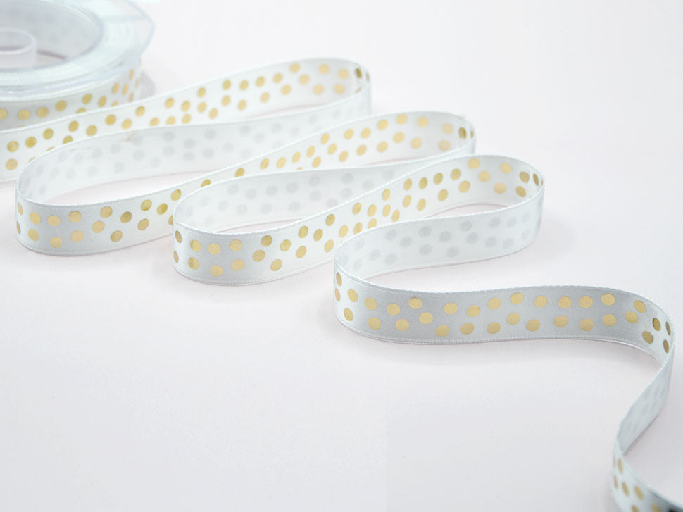 D.Raso 16 MM St. Laminata Pois Oro. Il nastro elegante e raffinato per definizione è il doppio raso, qui è presentato in una variante stampata. È versatile e bello da lavorare e, nella sua semplicità, si presta ad ogni utilizzo. Essendo un prodotto di alta qualità si annoda molto facilmente formando un bel fiocco con le code che presentano un taglio netto e definito, che non si sfilaccia. Il suo aspetto è luminoso, consistente e corposo, ma al tatto è decisamente delicato e setoso. I suoi 16mm di altezza e le infinite possibilità di personalizzazione lo rendono un nastro ideale per molteplici utilizzi: dalla confezione di bomboniere di matrimoni e cerimonie alla decorazione dei fiori e della tavola; dalle confezioni regalo, anche natalizie, a tutti gli eventi di pregio.. Codice colore# 102 - CONFEZIONATO IN BOBINA DA METRI 10