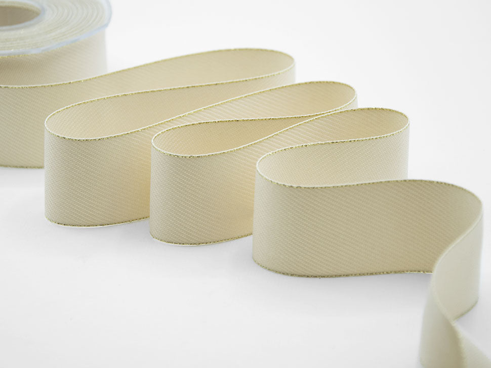 Diagonale Bordi Oro 40 MM Avorio. Il nastro elegante e raffinato per definizione è il doppio raso, qui è presentato in una variante stampata. È versatile e bello da lavorare e, nella sua semplicità, si presta ad ogni utilizzo. Essendo un prodotto di alta qualità si annoda molto facilmente formando un bel fiocco con le code che presentano un taglio netto e definito, che non si sfilaccia. Il suo aspetto è luminoso, consistente e corposo, ma al tatto è decisamente delicato e setoso. Le infinite possibilità di personalizzazione lo rendono un nastro ideale per molteplici utilizzi: dalla confezione di bomboniere di matrimoni e cerimonie alla decorazione dei fiori e della tavola; dalle confezioni regalo, anche natalizie, a tutti gli eventi di pregio.. Codice colore# 35 - CONFEZIONATO IN BOBINA DA METRI 15