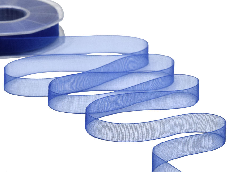 Organza 15mm Blu Cina. Nastro in velo di organza, trasparente, perfetto per le nozze e la decorazione del matrimonio e nei pacchetti regalo. È tessuto con un filato di organza lucido. Codice colore #654 - CONFEZIONATO IN BOBINA DA METRI 50