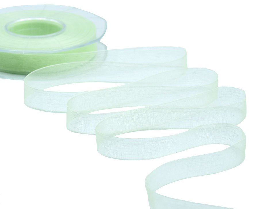 Organza 15mm Verde Mela Chiaro. Nastro in velo di organza, trasparente, perfetto per le nozze e la decorazione del matrimonio e nei pacchetti regalo. È tessuto con un filato di organza lucido. Codice colore #549 - CONFEZIONATO IN BOBINA DA METRI 50