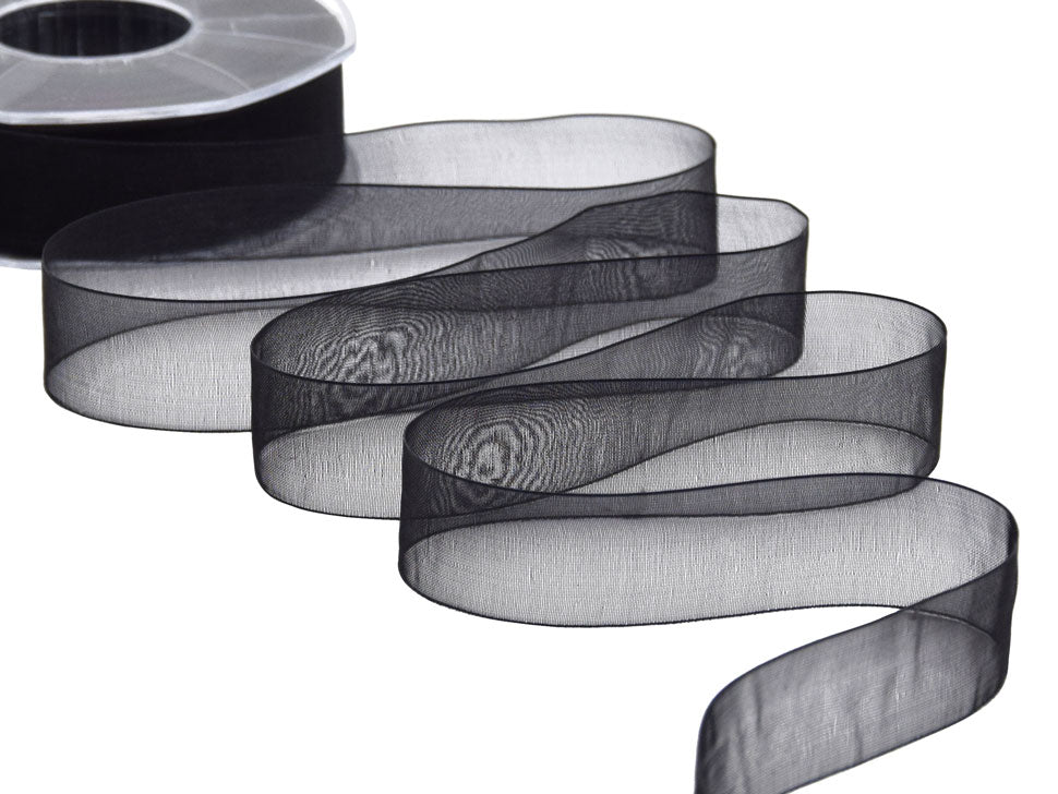 Organza 25mm Nero. Nastro in velo di organza, trasparente, perfetto per le nozze e la decorazione del matrimonio e nei pacchetti regalo. È tessuto con un filato di organza lucido. Codice colore #33 - CONFEZIONATO IN BOBINA DA METRI 50
