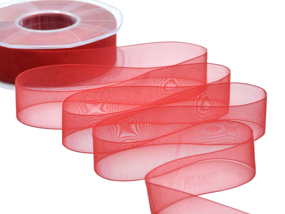 Organza 25mm Rosso. Nastro in velo di organza, trasparente, perfetto per le nozze e la decorazione del matrimonio e nei pacchetti regalo. È tessuto con un filato di organza lucido. Codice colore #31 - CONFEZIONATO IN BOBINA DA METRI 50