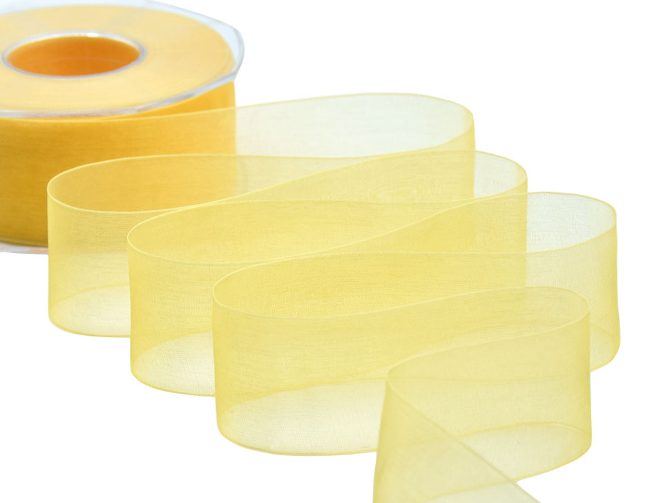 Organza 40mm Giallo Sole. Nastro in velo di organza, trasparente, perfetto per le nozze e la decorazione del matrimonio e nei pacchetti regalo. È tessuto con un filato di organza lucido. Codice colore #1006 - CONFEZIONATO IN BOBINA DA METRI 50