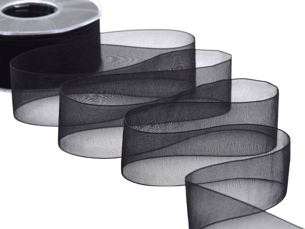 Organza 40mm Nero. Nastro in velo di organza, trasparente, perfetto per le nozze e la decorazione del matrimonio e nei pacchetti regalo. È tessuto con un filato di organza lucido. Codice colore #33 - CONFEZIONATO IN BOBINA DA METRI 50