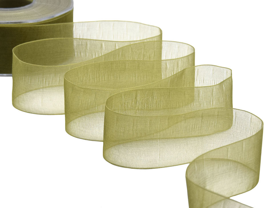 Organza 40mm Verde Muschio. Nastro in velo di organza, trasparente, perfetto per le nozze e la decorazione del matrimonio e nei pacchetti regalo. È tessuto con un filato di organza lucido. Codice colore #39 - CONFEZIONATO IN BOBINA DA METRI 50