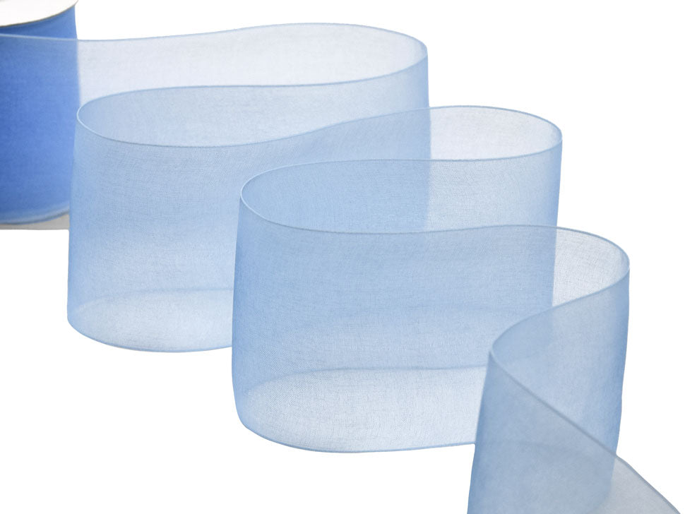 Organza 70mm Azzurro Baby. Nastro in velo di organza, trasparente, perfetto per le nozze e la decorazione del matrimonio e nei pacchetti regalo. È tessuto con un filato di organza lucido. Codice colore #593 - CONFEZIONATO IN BOBINA DA METRI 25