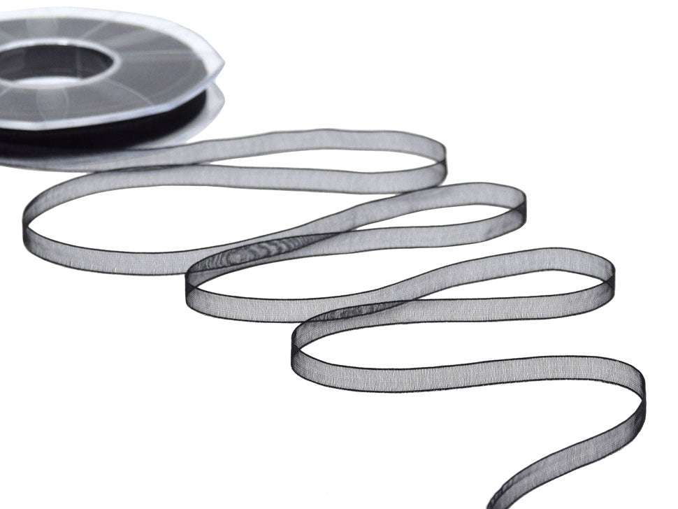 Organza 7mm Nero. Nastro in velo di organza, trasparente, perfetto per le nozze e la decorazione del matrimonio e nei pacchetti regalo. È tessuto con un filato di organza lucido. Codice colore #33 - CONFEZIONATO IN BOBINA DA METRI 50