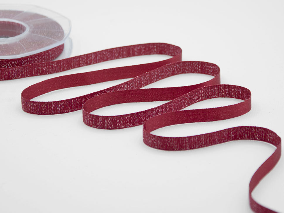Raso Boutique Lame 10 MM Amaranto. Questa magnifica variante del nostro doppio raso è caratterizzata dalla tramatura con filato lamè che da un lato dona un aspetto glitter al nastro, dall'altro un aspetto più elegante e raffinato con la presenza del lamè delicata e tenue. Il Raso lamé è adatto a tutte le confezioni per il Natale, alle nozze, alle celebrazioni eleganti e glamour.. Codice colore# 46 - CONFEZIONATO IN BOBINA DA METRI 20