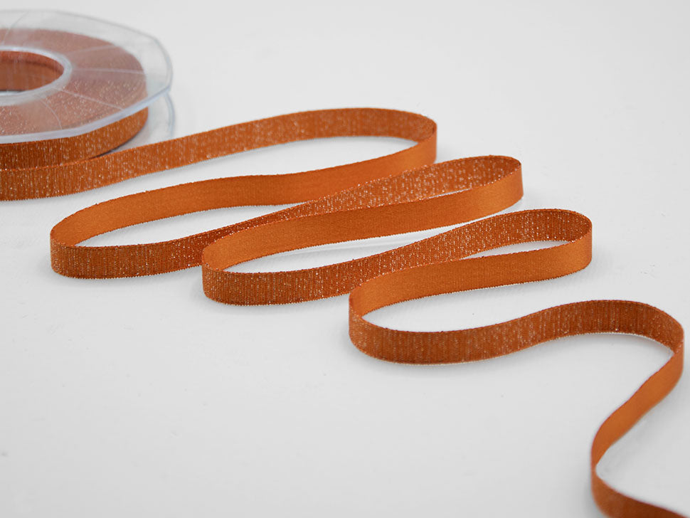 Raso Boutique Lame 10 MM Arancio Pesca. Questa magnifica variante del nostro doppio raso è caratterizzata dalla tramatura con filato lamè che da un lato dona un aspetto glitter al nastro, dall'altro un aspetto più elegante e raffinato con la presenza del lamè delicata e tenue. Il Raso lamé è adatto a tutte le confezioni per il Natale, alle nozze, alle celebrazioni eleganti e glamour.. Codice colore# 41 - CONFEZIONATO IN BOBINA DA METRI 20