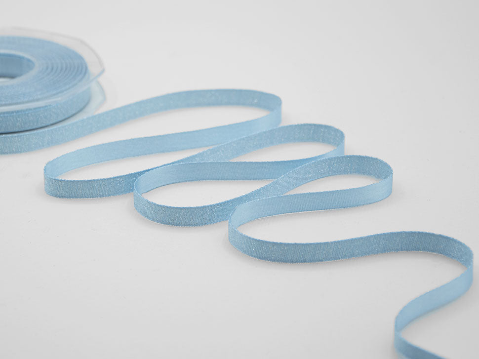 Raso Boutique Lame 10 MM Azzurro Baby. Questa magnifica variante del nostro doppio raso è caratterizzata dalla tramatura con filato lamè che da un lato dona un aspetto glitter al nastro, dall'altro un aspetto più elegante e raffinato con la presenza del lamè delicata e tenue. Il Raso lamé è adatto a tutte le confezioni per il Natale, alle nozze, alle celebrazioni eleganti e glamour.. Codice colore# 593 - CONFEZIONATO IN BOBINA DA METRI 20