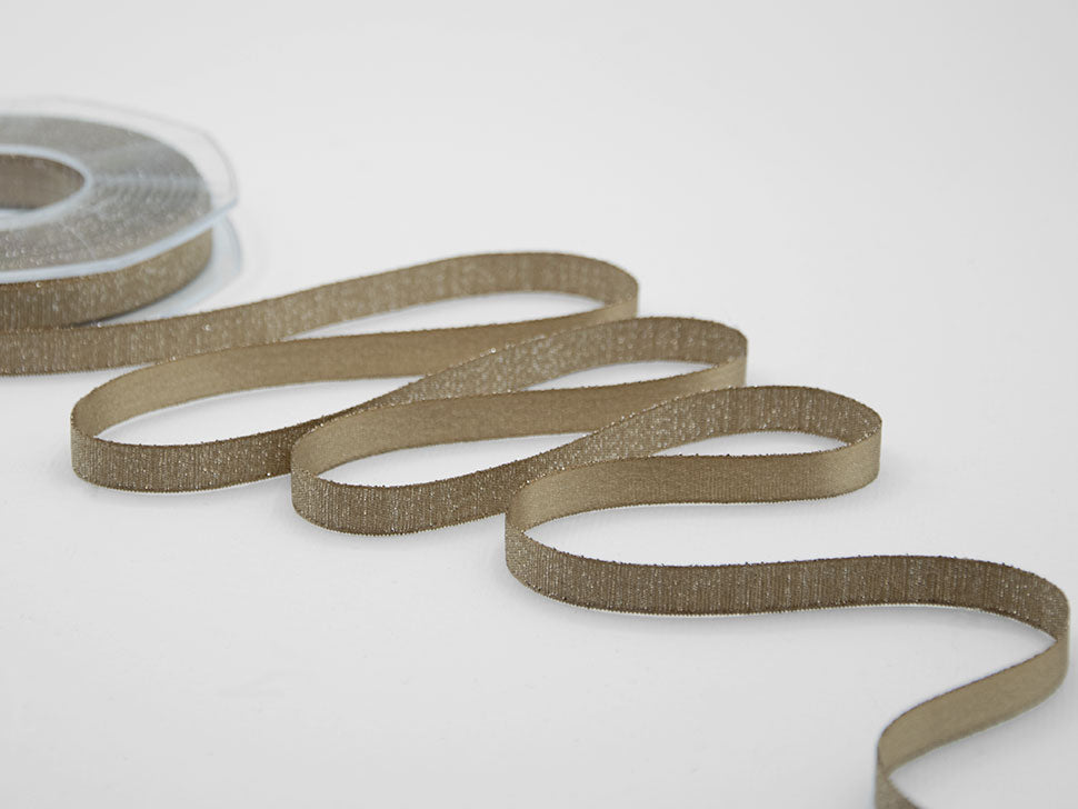 Raso Boutique Lame 10 MM Cannella. Questa magnifica variante del nostro doppio raso è caratterizzata dalla tramatura con filato lamè che da un lato dona un aspetto glitter al nastro, dall'altro un aspetto più elegante e raffinato con la presenza del lamè delicata e tenue. Il Raso lamé è adatto a tutte le confezioni per il Natale, alle nozze, alle celebrazioni eleganti e glamour.. Codice colore# 55 - CONFEZIONATO IN BOBINA DA METRI 20