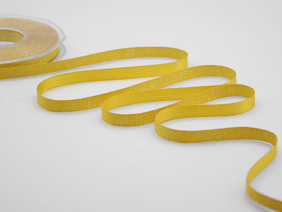 Raso Boutique Lame 10 MM Giallo Sole. Questa magnifica variante del nostro doppio raso è caratterizzata dalla tramatura con filato lamè che da un lato dona un aspetto glitter al nastro, dall'altro un aspetto più elegante e raffinato con la presenza del lamè delicata e tenue. Il Raso lamé è adatto a tutte le confezioni per il Natale, alle nozze, alle celebrazioni eleganti e glamour.. Codice colore# 1006 - CONFEZIONATO IN BOBINA DA METRI 20