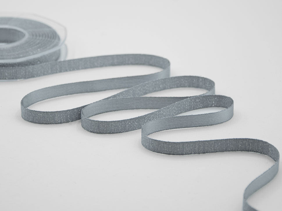 Raso Boutique Lame 10 MM Grigio Scuro. Questa magnifica variante del nostro doppio raso è caratterizzata dalla tramatura con filato lamè che da un lato dona un aspetto glitter al nastro, dall'altro un aspetto più elegante e raffinato con la presenza del lamè delicata e tenue. Il Raso lamé è adatto a tutte le confezioni per il Natale, alle nozze, alle celebrazioni eleganti e glamour.. Codice colore# 75 - CONFEZIONATO IN BOBINA DA METRI 20