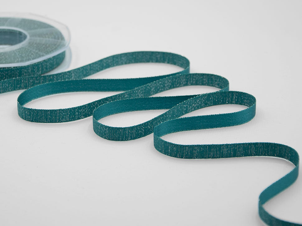 Raso Boutique Lame 10 MM Ottanio. Questa magnifica variante del nostro doppio raso è caratterizzata dalla tramatura con filato lamè che da un lato dona un aspetto glitter al nastro, dall'altro un aspetto più elegante e raffinato con la presenza del lamè delicata e tenue. Il Raso lamé è adatto a tutte le confezioni per il Natale, alle nozze, alle celebrazioni eleganti e glamour.. Codice colore# 65 - CONFEZIONATO IN BOBINA DA METRI 20