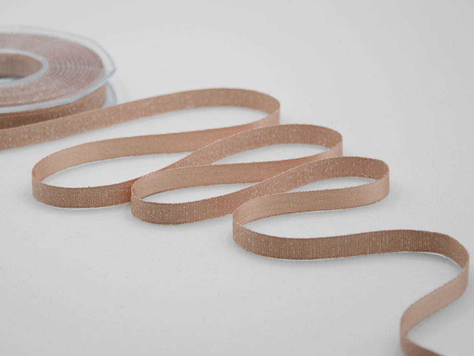 Raso Boutique Lame 10 MM Salmone. Questa magnifica variante del nostro doppio raso è caratterizzata dalla tramatura con filato lamè che da un lato dona un aspetto glitter al nastro, dall'altro un aspetto più elegante e raffinato con la presenza del lamè delicata e tenue. Il Raso lamé è adatto a tutte le confezioni per il Natale, alle nozze, alle celebrazioni eleganti e glamour.. Codice colore# 25 - CONFEZIONATO IN BOBINA DA METRI 20