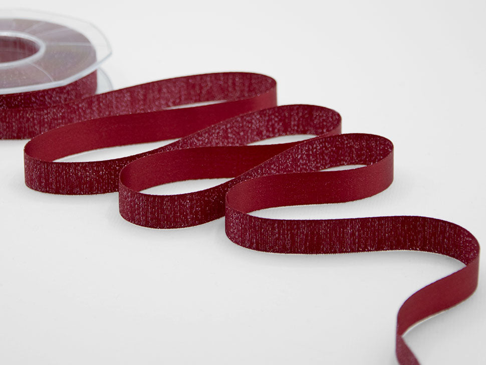 Raso Boutique Lame 16 MM Amaranto. Questa magnifica variante del nostro doppio raso è caratterizzata dalla tramatura con filato lamè che da un lato dona un aspetto glitter al nastro, dall'altro un aspetto più elegante e raffinato con la presenza del lamè delicata e tenue. Il Raso lamé è adatto a tutte le confezioni per il Natale, alle nozze, alle celebrazioni eleganti e glamour.. Codice colore# 46 - CONFEZIONATO IN BOBINA DA METRI 20