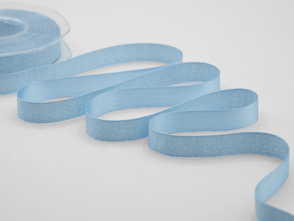 Raso Boutique Lame 16 MM Azzurro Baby. Questa magnifica variante del nostro doppio raso è caratterizzata dalla tramatura con filato lamè che da un lato dona un aspetto glitter al nastro, dall'altro un aspetto più elegante e raffinato con la presenza del lamè delicata e tenue. Il Raso lamé è adatto a tutte le confezioni per il Natale, alle nozze, alle celebrazioni eleganti e glamour.. Codice colore# 593 - CONFEZIONATO IN BOBINA DA METRI 20