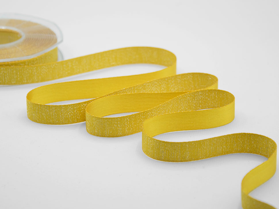Raso Boutique Lame 16 MM Giallo Sole. Questa magnifica variante del nostro doppio raso è caratterizzata dalla tramatura con filato lamè che da un lato dona un aspetto glitter al nastro, dall'altro un aspetto più elegante e raffinato con la presenza del lamè delicata e tenue. Il Raso lamé è adatto a tutte le confezioni per il Natale, alle nozze, alle celebrazioni eleganti e glamour.. Codice colore# 1006 - CONFEZIONATO IN BOBINA DA METRI 20
