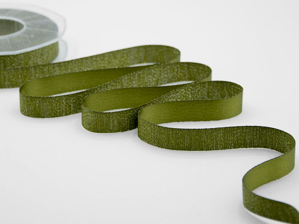 Raso Boutique Lame 16 MM Verde Muschio. Questa magnifica variante del nostro doppio raso è caratterizzata dalla tramatura con filato lamè che da un lato dona un aspetto glitter al nastro, dall'altro un aspetto più elegante e raffinato con la presenza del lamè delicata e tenue. Il Raso lamé è adatto a tutte le confezioni per il Natale, alle nozze, alle celebrazioni eleganti e glamour.. Codice colore# 39 - CONFEZIONATO IN BOBINA DA METRI 20