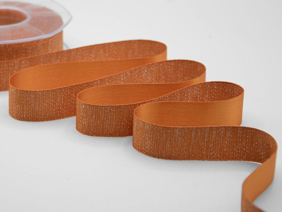 Raso Boutique Lame 25 MM Arancio Pesca. Questa magnifica variante del nostro doppio raso è caratterizzata dalla tramatura con filato lamè che da un lato dona un aspetto glitter al nastro, dall'altro un aspetto più elegante e raffinato con la presenza del lamè delicata e tenue. Il Raso lamé è adatto a tutte le confezioni per il Natale, alle nozze, alle celebrazioni eleganti e glamour.. Codice colore# 41 - CONFEZIONATO IN BOBINA DA METRI 20