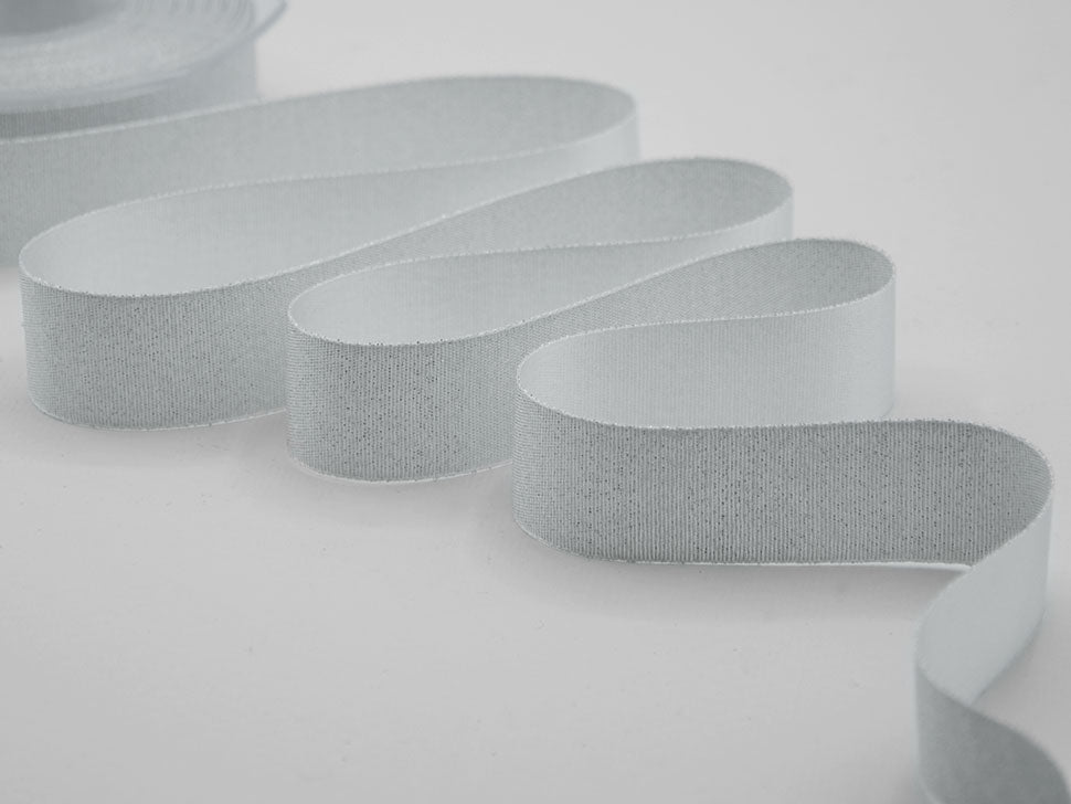 Raso Boutique Lame 25 MM Argento. Questa magnifica variante del nostro doppio raso è caratterizzata dalla tramatura con filato lamè che da un lato dona un aspetto glitter al nastro, dall'altro un aspetto più elegante e raffinato con la presenza del lamè delicata e tenue. Il Raso lamé è adatto a tutte le confezioni per il Natale, alle nozze, alle celebrazioni eleganti e glamour.. Codice colore# 101 - CONFEZIONATO IN BOBINA DA METRI 20