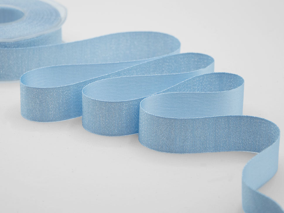 Raso Boutique Lame 25 MM Azzurro Baby. Questa magnifica variante del nostro doppio raso è caratterizzata dalla tramatura con filato lamè che da un lato dona un aspetto glitter al nastro, dall'altro un aspetto più elegante e raffinato con la presenza del lamè delicata e tenue. Il Raso lamé è adatto a tutte le confezioni per il Natale, alle nozze, alle celebrazioni eleganti e glamour.. Codice colore# 593 - CONFEZIONATO IN BOBINA DA METRI 20