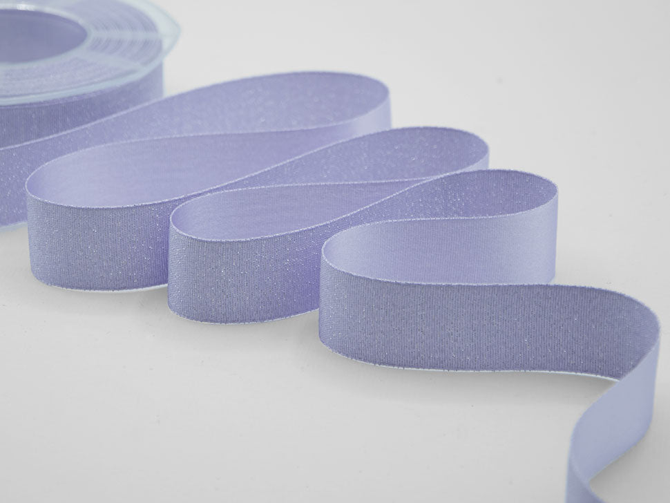 Raso Boutique Lame 25 MM Lilla. Questa magnifica variante del nostro doppio raso è caratterizzata dalla tramatura con filato lamè che da un lato dona un aspetto glitter al nastro, dall'altro un aspetto più elegante e raffinato con la presenza del lamè delicata e tenue. Il Raso lamé è adatto a tutte le confezioni per il Natale, alle nozze, alle celebrazioni eleganti e glamour.. Codice colore# 67 - CONFEZIONATO IN BOBINA DA METRI 20