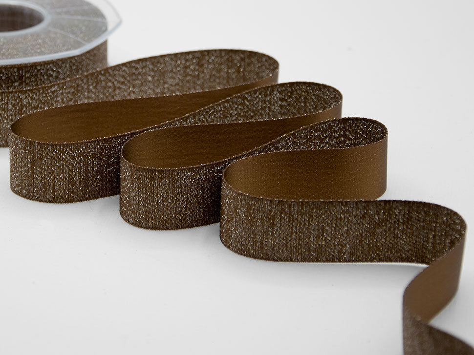 Raso Boutique Lame 25 MM Marrone. Questa magnifica variante del nostro doppio raso è caratterizzata dalla tramatura con filato lamè che da un lato dona un aspetto glitter al nastro, dall'altro un aspetto più elegante e raffinato con la presenza del lamè delicata e tenue. Il Raso lamé è adatto a tutte le confezioni per il Natale, alle nozze, alle celebrazioni eleganti e glamour.. Codice colore# 44 - CONFEZIONATO IN BOBINA DA METRI 20