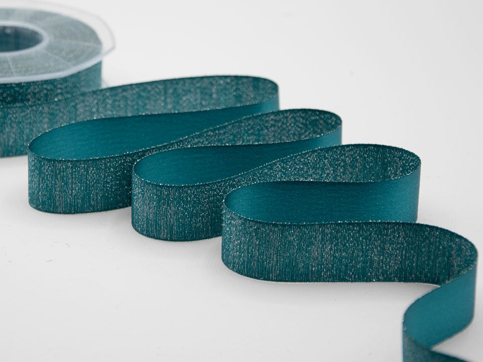 Raso Boutique Lame 25 MM Ottanio. Questa magnifica variante del nostro doppio raso è caratterizzata dalla tramatura con filato lamè che da un lato dona un aspetto glitter al nastro, dall'altro un aspetto più elegante e raffinato con la presenza del lamè delicata e tenue. Il Raso lamé è adatto a tutte le confezioni per il Natale, alle nozze, alle celebrazioni eleganti e glamour.. Codice colore# 65 - CONFEZIONATO IN BOBINA DA METRI 20