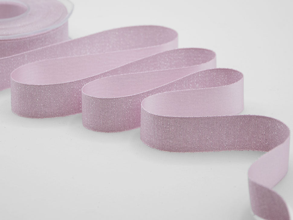 Raso Boutique Lame 25 MM Rosa Baby. Questa magnifica variante del nostro doppio raso è caratterizzata dalla tramatura con filato lamè che da un lato dona un aspetto glitter al nastro, dall'altro un aspetto più elegante e raffinato con la presenza del lamè delicata e tenue. Il Raso lamé è adatto a tutte le confezioni per il Natale, alle nozze, alle celebrazioni eleganti e glamour.. Codice colore# 20 - CONFEZIONATO IN BOBINA DA METRI 20