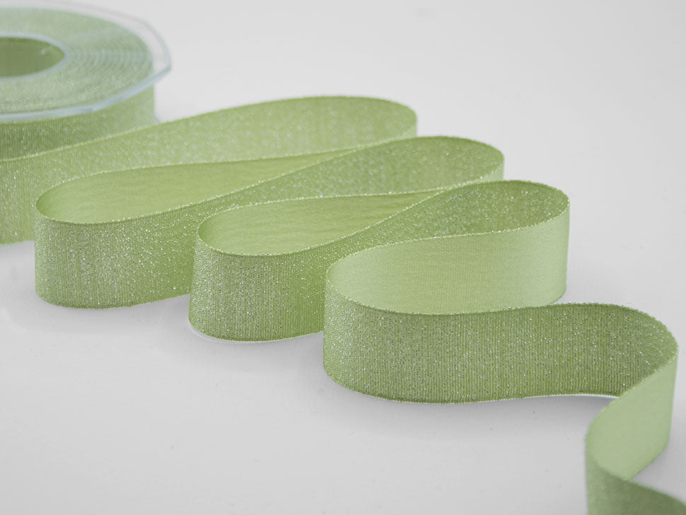 Raso Boutique Lame 25 MM Verde Prato. Questa magnifica variante del nostro doppio raso è caratterizzata dalla tramatura con filato lamè che da un lato dona un aspetto glitter al nastro, dall'altro un aspetto più elegante e raffinato con la presenza del lamè delicata e tenue. Il Raso lamé è adatto a tutte le confezioni per il Natale, alle nozze, alle celebrazioni eleganti e glamour.. Codice colore# 7 - CONFEZIONATO IN BOBINA DA METRI 20