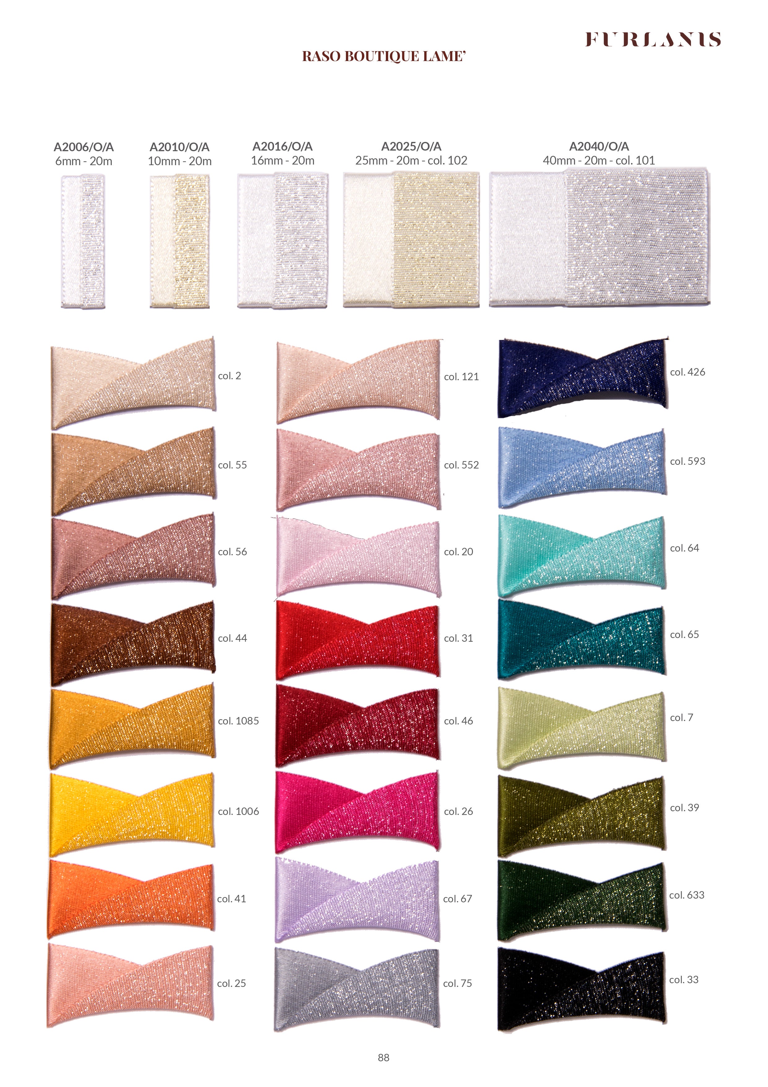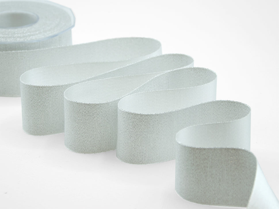 Raso Boutique Lame 40 MM Argento. Questa magnifica variante del nostro doppio raso è caratterizzata dalla tramatura con filato lamè che da un lato dona un aspetto glitter al nastro, dall'altro un aspetto più elegante e raffinato con la presenza del lamè delicata e tenue. Il Raso lamé è adatto a tutte le confezioni per il Natale, alle nozze, alle celebrazioni eleganti e glamour.. Codice colore# 101 - CONFEZIONATO IN BOBINA DA METRI 20