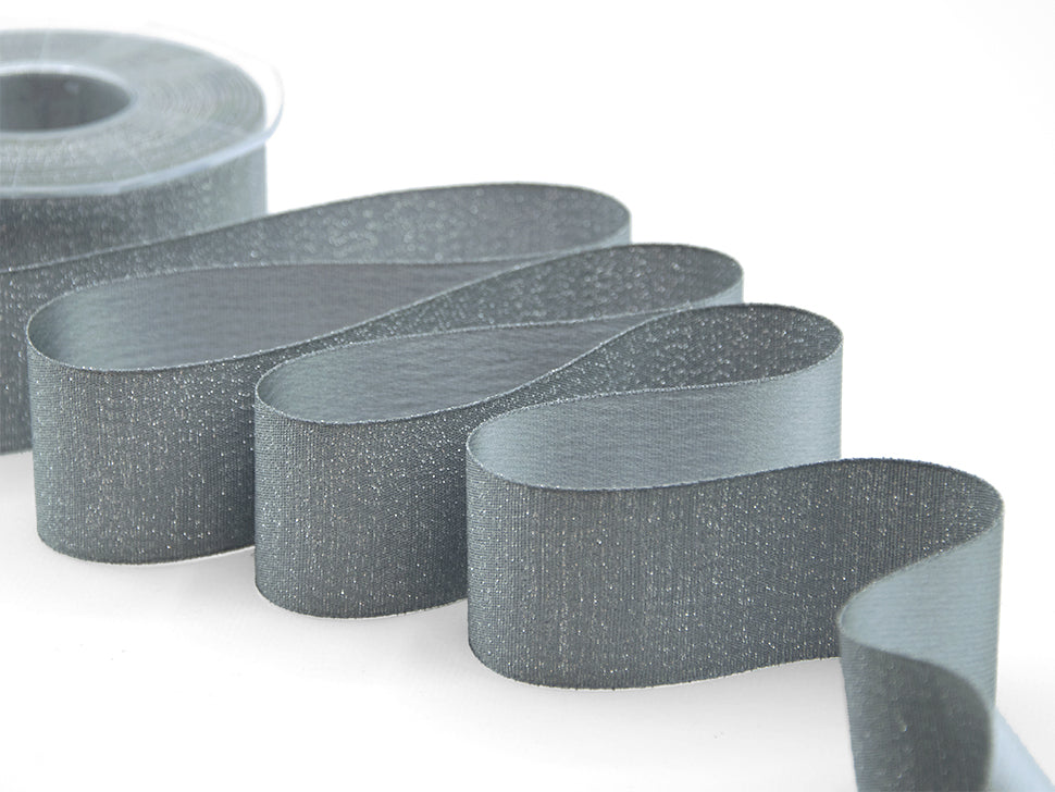 Raso Boutique Lame 40 MM Grigio Scuro. Questa magnifica variante del nostro doppio raso è caratterizzata dalla tramatura con filato lamè che da un lato dona un aspetto glitter al nastro, dall'altro un aspetto più elegante e raffinato con la presenza del lamè delicata e tenue. Il Raso lamé è adatto a tutte le confezioni per il Natale, alle nozze, alle celebrazioni eleganti e glamour.. Codice colore# 75 - CONFEZIONATO IN BOBINA DA METRI 20