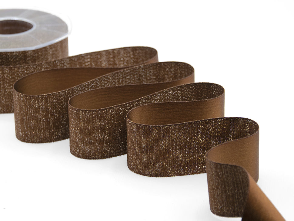Raso Boutique Lame 40 MM Marrone. Questa magnifica variante del nostro doppio raso è caratterizzata dalla tramatura con filato lamè che da un lato dona un aspetto glitter al nastro, dall'altro un aspetto più elegante e raffinato con la presenza del lamè delicata e tenue. Il Raso lamé è adatto a tutte le confezioni per il Natale, alle nozze, alle celebrazioni eleganti e glamour.. Codice colore# 44 - CONFEZIONATO IN BOBINA DA METRI 20