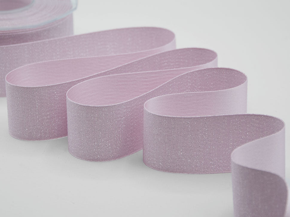 Raso Boutique Lame 40 MM Rosa Baby. Questa magnifica variante del nostro doppio raso è caratterizzata dalla tramatura con filato lamè che da un lato dona un aspetto glitter al nastro, dall'altro un aspetto più elegante e raffinato con la presenza del lamè delicata e tenue. Il Raso lamé è adatto a tutte le confezioni per il Natale, alle nozze, alle celebrazioni eleganti e glamour.. Codice colore# 20 - CONFEZIONATO IN BOBINA DA METRI 20
