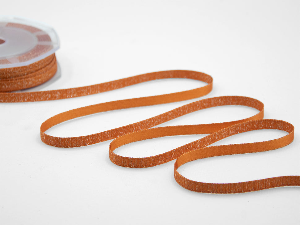 Raso Boutique Lame 6 MM Arancio Pesca. Questa magnifica variante del nostro doppio raso è caratterizzata dalla tramatura con filato lamè che da un lato dona un aspetto glitter al nastro, dall'altro un aspetto più elegante e raffinato con la presenza del lamè delicata e tenue. Il Raso lamé è adatto a tutte le confezioni per il Natale, alle nozze, alle celebrazioni eleganti e glamour.. Codice colore# 41 - CONFEZIONATO IN BOBINA DA METRI 20