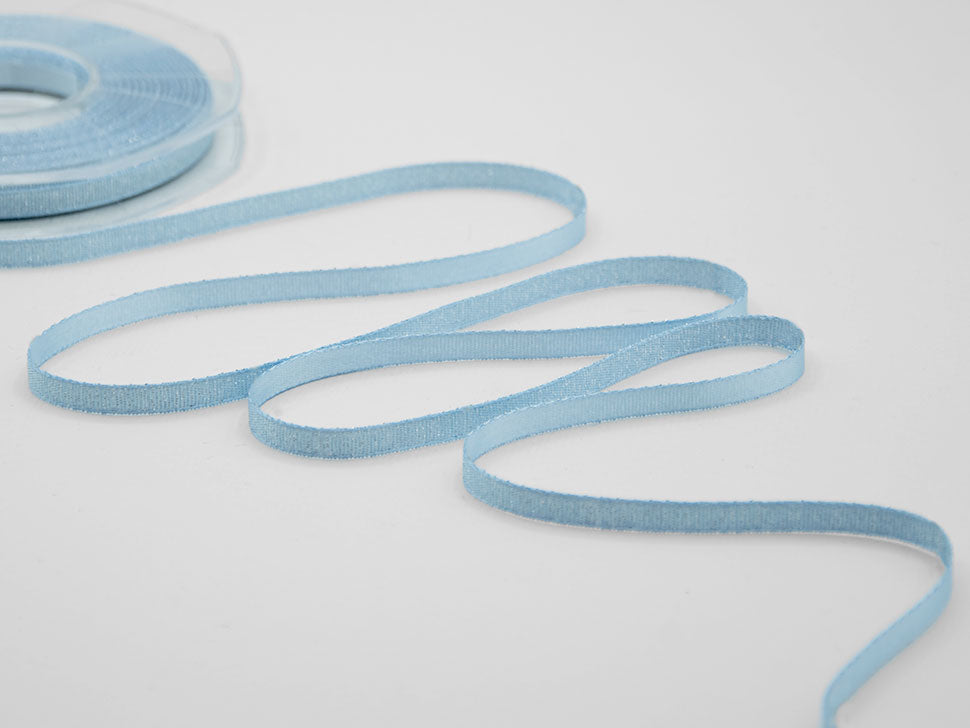 Raso Boutique Lame 6 MM Azzurro Baby. Questa magnifica variante del nostro doppio raso è caratterizzata dalla tramatura con filato lamè che da un lato dona un aspetto glitter al nastro, dall'altro un aspetto più elegante e raffinato con la presenza del lamè delicata e tenue. Il Raso lamé è adatto a tutte le confezioni per il Natale, alle nozze, alle celebrazioni eleganti e glamour.. Codice colore# 593 - CONFEZIONATO IN BOBINA DA METRI 20