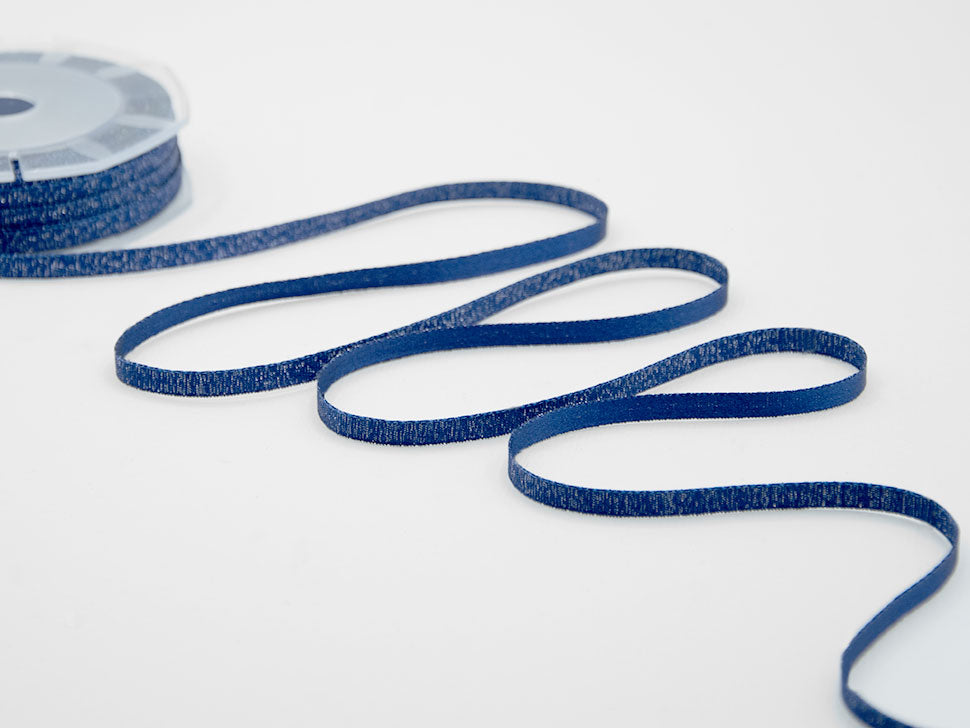 Raso Boutique Lame 6 MM Blu Scuro. Questa magnifica variante del nostro doppio raso è caratterizzata dalla tramatura con filato lamè che da un lato dona un aspetto glitter al nastro, dall'altro un aspetto più elegante e raffinato con la presenza del lamè delicata e tenue. Il Raso lamé è adatto a tutte le confezioni per il Natale, alle nozze, alle celebrazioni eleganti e glamour.. Codice colore# 426 - CONFEZIONATO IN BOBINA DA METRI 20