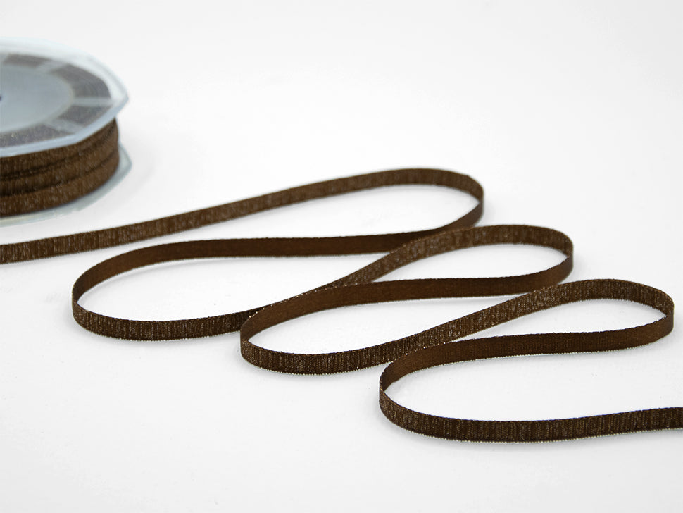 Raso Boutique Lame 6 MM Marrone. Questa magnifica variante del nostro doppio raso è caratterizzata dalla tramatura con filato lamè che da un lato dona un aspetto glitter al nastro, dall'altro un aspetto più elegante e raffinato con la presenza del lamè delicata e tenue. Il Raso lamé è adatto a tutte le confezioni per il Natale, alle nozze, alle celebrazioni eleganti e glamour.. Codice colore# 44 - CONFEZIONATO IN BOBINA DA METRI 20