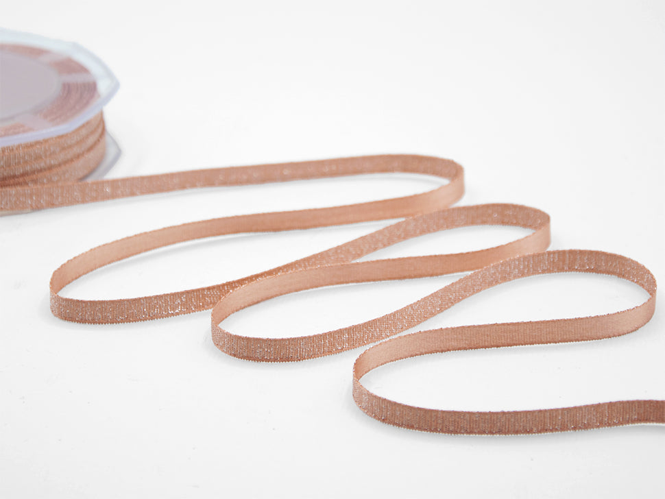 Raso Boutique Lame 6 MM Salmone. Questa magnifica variante del nostro doppio raso è caratterizzata dalla tramatura con filato lamè che da un lato dona un aspetto glitter al nastro, dall'altro un aspetto più elegante e raffinato con la presenza del lamè delicata e tenue. Il Raso lamé è adatto a tutte le confezioni per il Natale, alle nozze, alle celebrazioni eleganti e glamour.. Codice colore# 25 - CONFEZIONATO IN BOBINA DA METRI 20