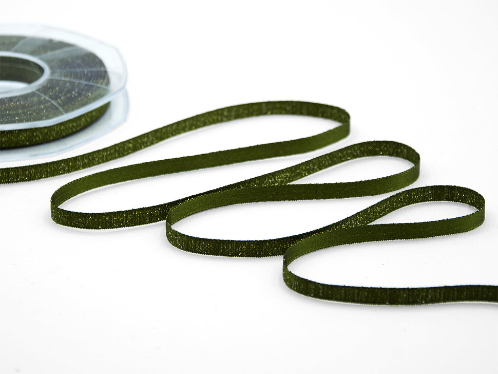 Raso Boutique Lame 6 MM Verde Muschio. Questa magnifica variante del nostro doppio raso è caratterizzata dalla tramatura con filato lamè che da un lato dona un aspetto glitter al nastro, dall'altro un aspetto più elegante e raffinato con la presenza del lamè delicata e tenue. Il Raso lamé è adatto a tutte le confezioni per il Natale, alle nozze, alle celebrazioni eleganti e glamour.. Codice colore# 39 - CONFEZIONATO IN BOBINA DA METRI 20