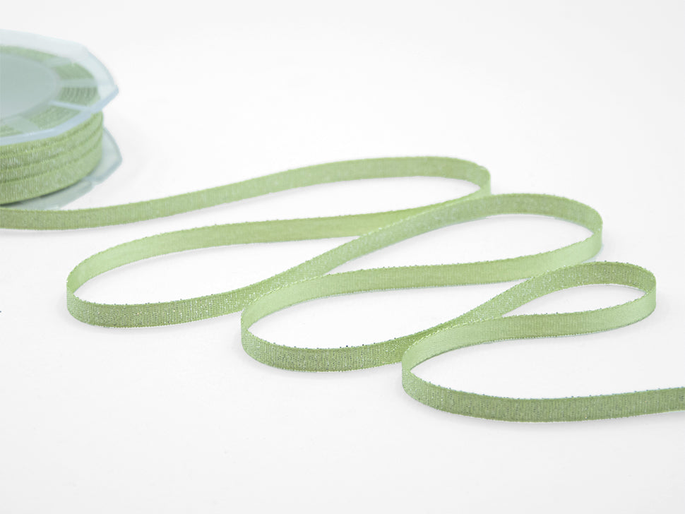 Raso Boutique Lame 6 MM Verde Prato. Questa magnifica variante del nostro doppio raso è caratterizzata dalla tramatura con filato lamè che da un lato dona un aspetto glitter al nastro, dall'altro un aspetto più elegante e raffinato con la presenza del lamè delicata e tenue. Il Raso lamé è adatto a tutte le confezioni per il Natale, alle nozze, alle celebrazioni eleganti e glamour.. Codice colore# 7 - CONFEZIONATO IN BOBINA DA METRI 20