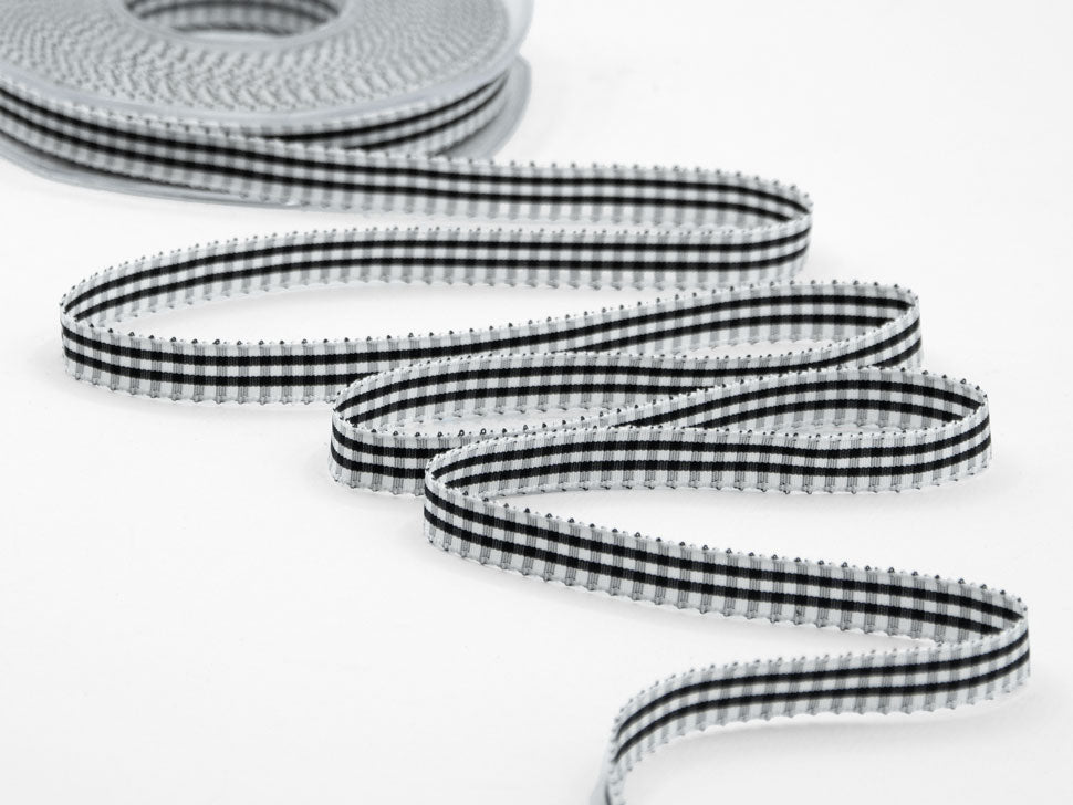 Bamby 10 MM Nero. Il Bamby è un nastro a quadretti, detto anche vichy, adatto agli utilizzi per le decorazioni dei bambini, come i fiocchi di nascita bimbo e bimba, oppure, negli altri colori, per confezioni country e rustiche. In questa versione è presentato con l'elastico su un bordo a formare una rouge molto comoda da applicare sui bordi. L’articolo T20/10 è un nastro con il motivo classico a quadri con bordi rifiniti più spessi Il nastro scozzese Vichy è un nastro semplice ma alla moda, facile da abbinare, può essere utilizzato con vari oggetti per creare un sapore retrò ed elegante. Il nastro T20 è realizzato con filato poliestere tinto in filo di alta qualità e ha la caratteristica di essere morbido al tatto, di non sbiadire al lavaggio e di avere un taglio netto e definito. Questo quadrettino è molto indicato per le realizzazioni dedicate ai più piccoli: dall’abbigliamento alla creazioni di bomboniere, usato invece nella variante di colore rosso il nastro Vichy è ideale per le decorazioni floreali, per la decorazione della casa, per la confezione dei pacchetti nei periodo di Natale, San Valentino e la festa della mamma. . Codice colore# 33 - CONFEZIONATO IN BOBINA DA METRI 25